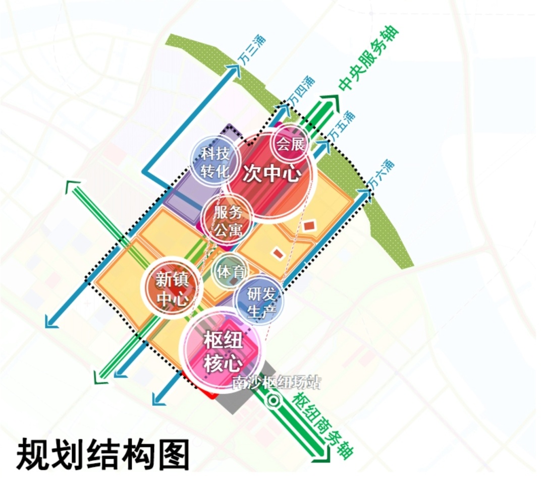 对于南沙枢纽区块,规划的关键词是“未来”。规划定位为南沙枢纽门户、未来产城极核。打造未来广州枢纽门户现代服务区、南沙新兴科创服务集聚区、未来城市与生态生活创新区三大主导功能。
