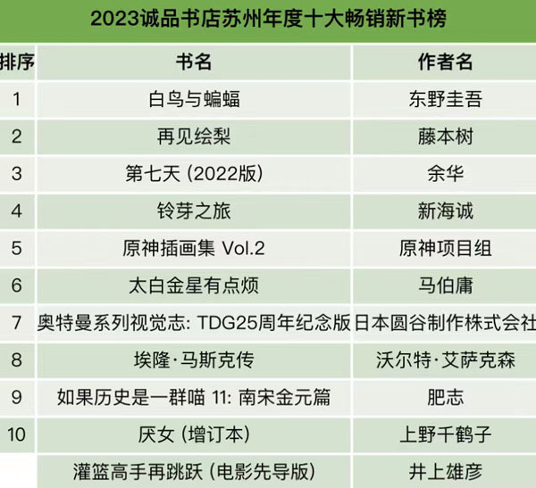 在发布年度阅读观察之外,诚品书店苏州根据本年度经营实绩,推出“年度十大畅销新书榜”,东野圭吾《白鸟与蝙蝠》、藤本树《再见绘梨》、余华《第七天(2022版)》位居前三。