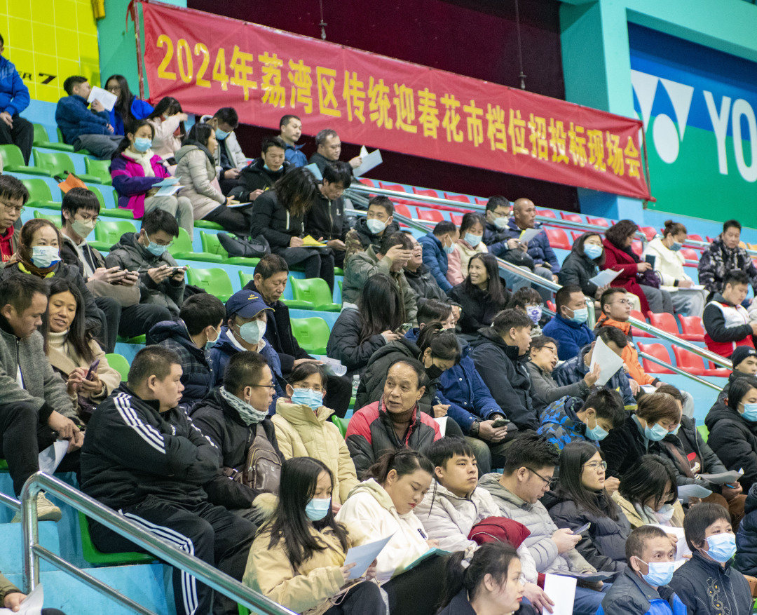 12月23日,2024年广州荔湾区迎春花市现场竞标大会在荔湾体育馆举行,荔湾花市也成为全市首个进行现场竞标的迎春花市。今年荔湾迎春花市档口总数有318个,除6个非遗档、20个非遗档,此次现场竞标共设置292个档位(其中鲜花档44个、枝花档36个、盆花档102个、工艺品档104个、棚头档6个),采取一次性报暗标方式竞投,经过激烈竞价,共280个公开招投标档位竞标成功。