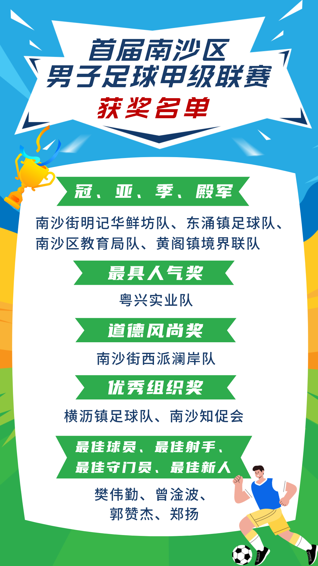 比赛结束后,举行了年度颁奖仪式。粤兴实业队获最具人气奖;大岗镇足球队、南沙街西派澜岸队获道德风尚奖;横沥镇足球队、南沙知促会获优秀组织奖;樊伟勤、曾淦波、郭赞杰、郑扬分获最佳球员、最佳射手、最佳守门员、最佳新人。