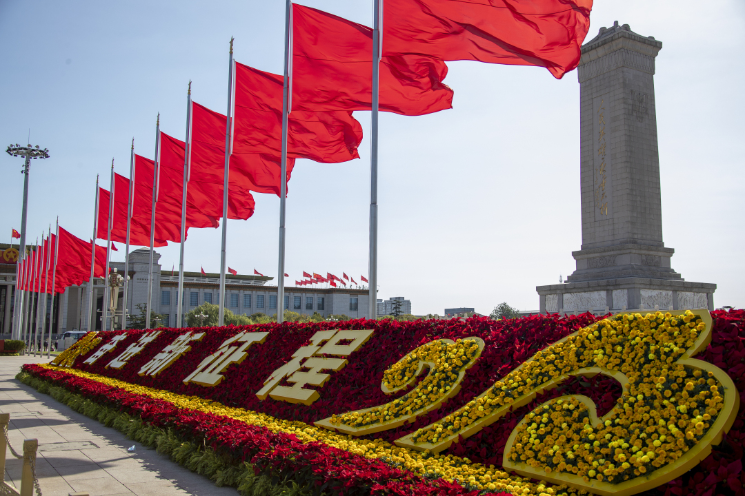 2022年10月16日,北京,中国共产党第二十次全国代表大会开幕,人民大会堂外红旗飘扬。