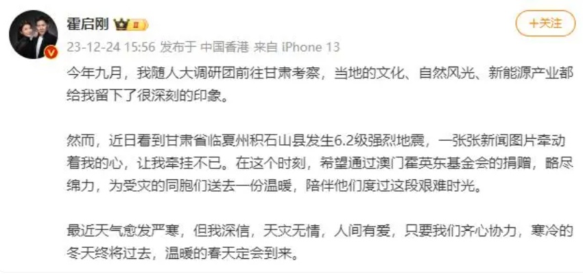 霍英东集团副总裁霍启刚12月24日在微博发文称,近日看到甘肃省临夏州积石山县发生6.2级强烈地震,“希望通过澳门霍英东基金会的捐赠,略尽绵力”。