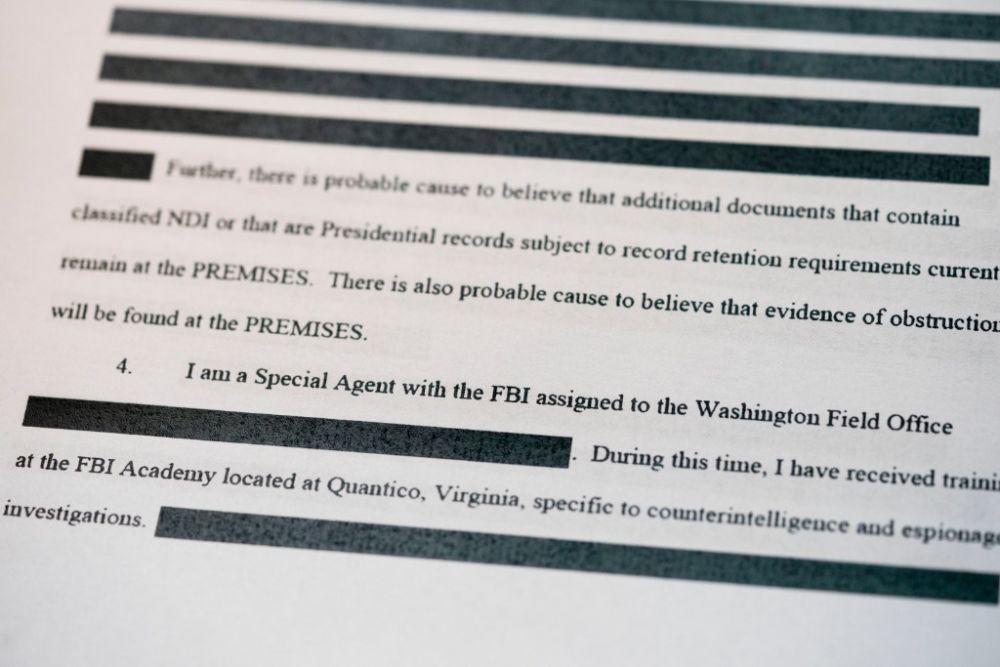 这是2022年8月26日拍摄的美国联邦调查局申请搜查前总统特朗普住所海湖庄园时向法院提交书面证词的部分内容。