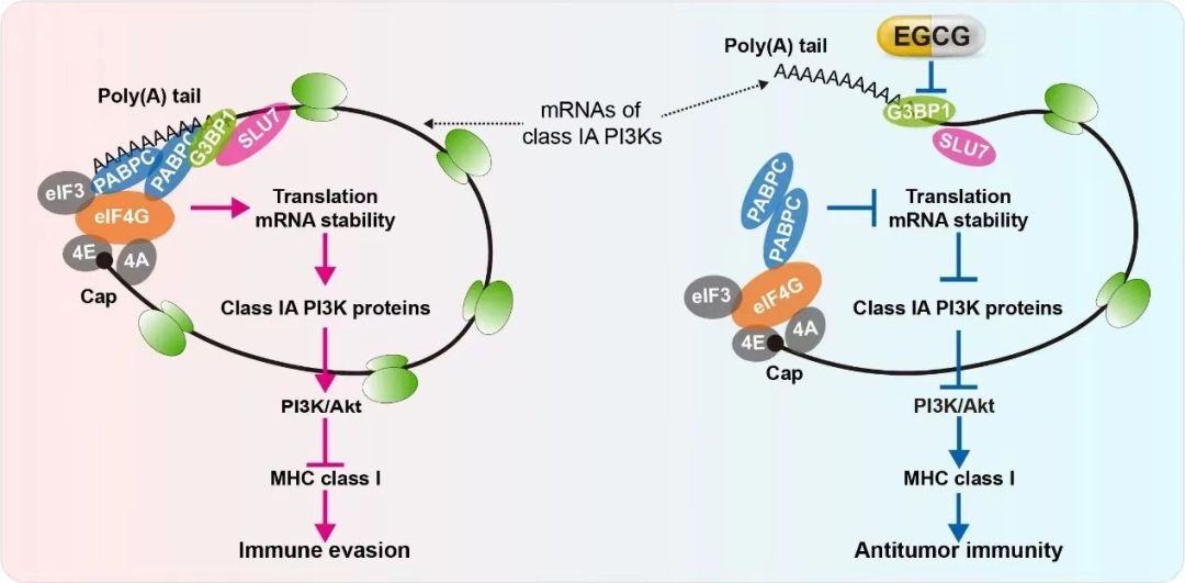 该研究结果表明,在膀胱癌细胞中,RNA结合蛋白G3BP1和SLU7相互依赖地结合在IA类PI3K亚基mRNA的3'-UTR区域,与真核起始因子eIF4G1以及mRNA多聚腺苷酸结合蛋白PABPC1共同形成复合体。该复合体的存在维持了IA类PI3K亚基mRNA的闭环结构稳定性并促进其翻译,进而促进PI3K/Akt信号激活,下调MHC-I,最终导致膀胱癌发生免疫逃逸。