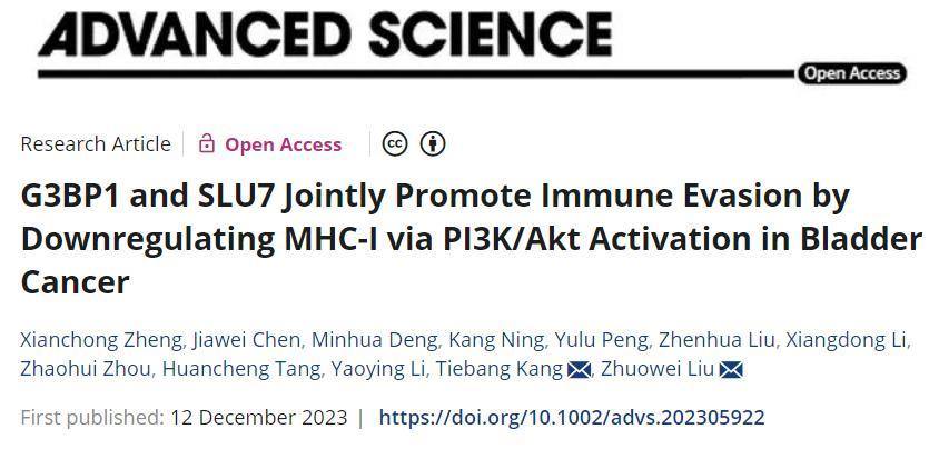 近日,中山大学肿瘤防治中心的刘卓炜教授团队在Advanced Science杂志上发表题为《G3BP1和SLU7联合促进PI3K/Akt活化下调MHC-I增强膀胱癌免疫逃逸》的研究论文(见下图)。该研究揭示了RNA结合蛋白G3BP1和SLU7通过联合促进PI3K/Akt信号活化而下调MHC-I进而增强膀胱癌免疫逃逸的作用机制,并探索了G3BP1抑制剂——表没食子儿茶素没食子酸酯(EGCG)在增强PD-1单抗疗效中的潜在作用。该研究结果对深入理解膀胱癌免疫逃逸的分子机制以及开发新型治疗策略具有重要意义。