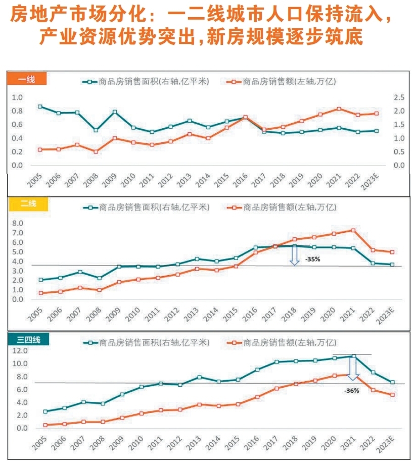 但城市之间的分化值得置业者给予关注。一二线城市人口保持流入,产业资源优势突出,新房规模有望逐步筑底;低能级城市住房回归消费属性,预计市场将延续回落态势,城镇化及购买力主导市场走势。