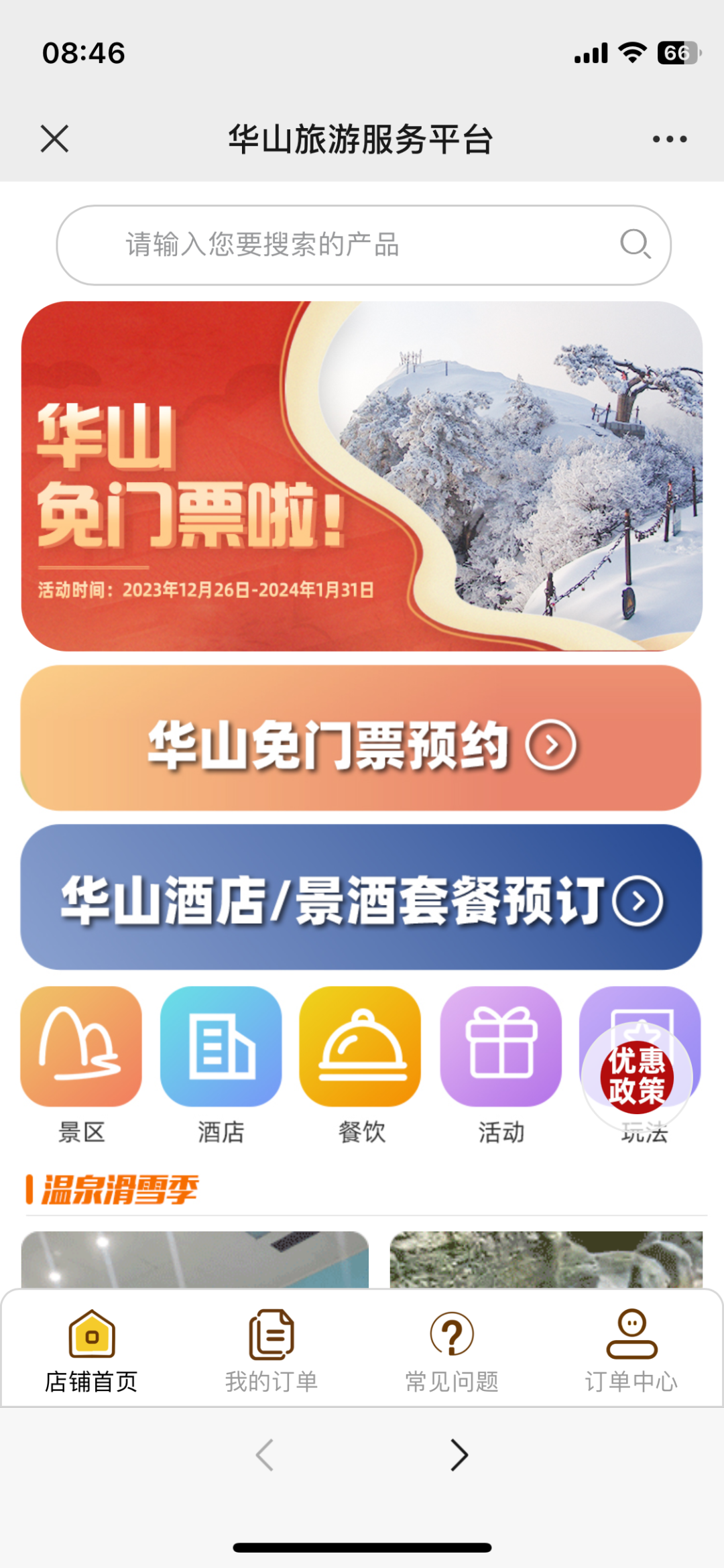 本次门票免费政策实行实名制分时预约。游客在华山景区“华山旅游服务平台”微信公众号或小程序上进行实名制分时预约,预约后持本人二代身份证入园,16周岁以下游客须有成年人陪同方可入园。华山景区同时提醒游客,注意天气变化和景区运营信息,如景区发生大面积降雪、道路结冰等恶劣天气,景区将临时采取线路管控或景区闭园措施,请广大游客谅解并合理安排自己行程。华山景区主要交通干道正在施工,易造成线路不畅。为了提升游客的登山游览体验,建议游客提前线上预约,按时入园。
