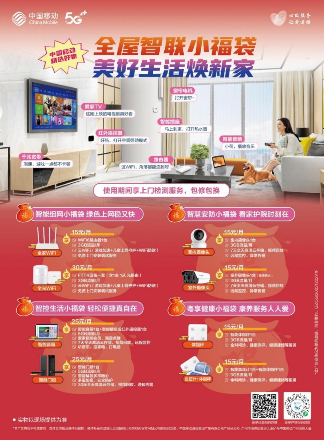 假期出门远游,担心家里财产安全?即日起至2024年1月31日,广州移动客户戳下图扫码可享全屋智联安防小福袋,摄像头+3GB/5GB流量+7天/30天云回看+安防通警报+时光轨迹精华回顾服务,高清画质监控影像,金融级信息加密,让监控回看更安全。此外还有智能组网小福袋、智控生活小福袋、粤享健康小福袋,全方位满足你的需求。