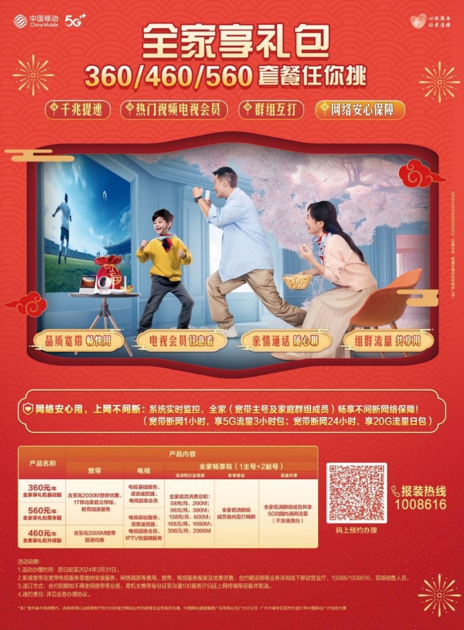 外面太冷,想窝在家看剧爽歪歪?即日起至2024年1月31日,广州移动客户戳下图扫码可享受全家享礼包,体验高质量网络的同时畅享电视直播及5大IPTV大屏会员服务、全家省内互打畅聊限免、月5G流量共享、得1T超大空间云盘,还能获得“网络安心保障”服务。话不多说,快来扫码体验吧!