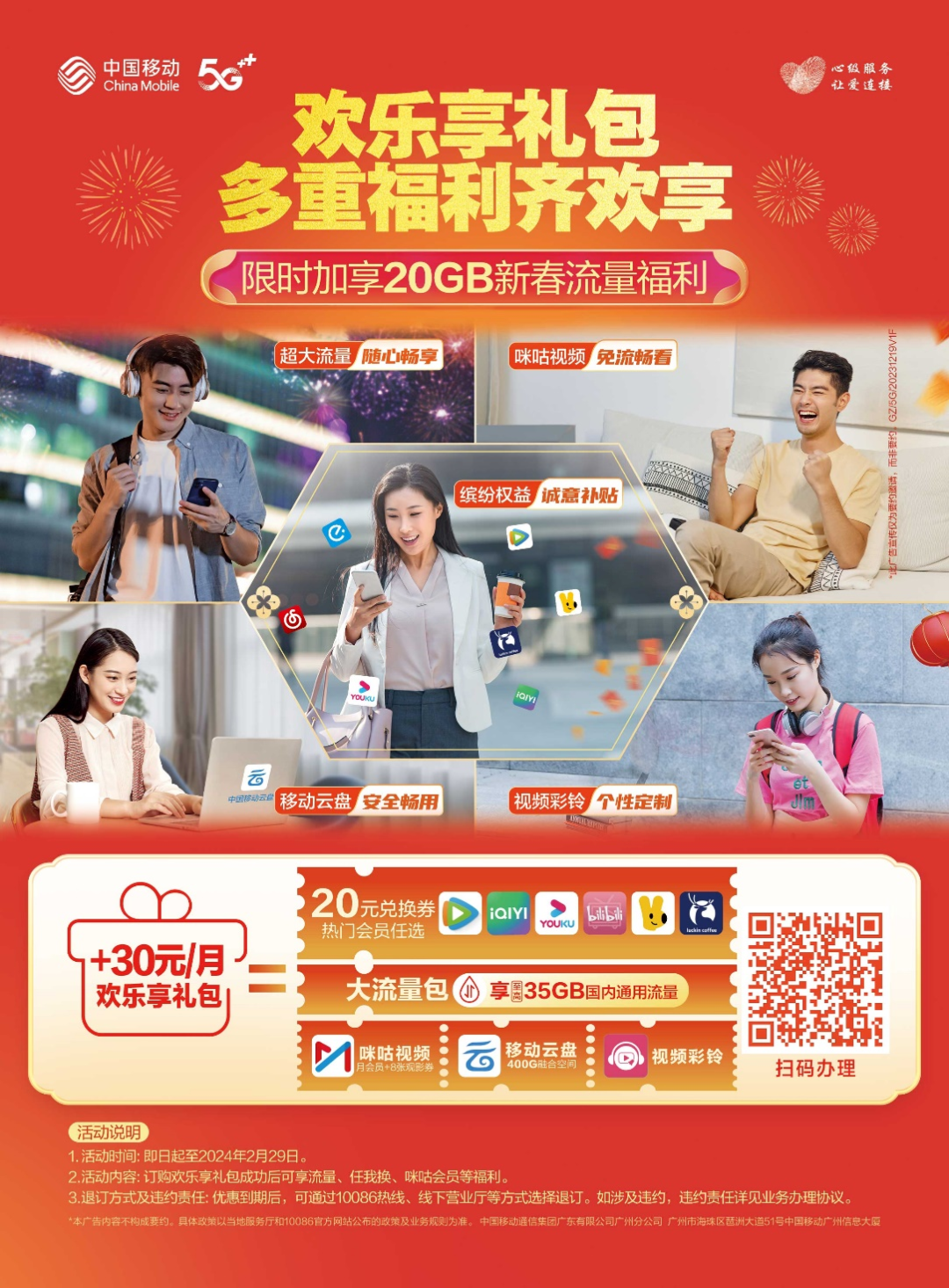 新年将至,欢乐享买一可得五?即日起至2024年2月29日,广州移动客户戳下图扫码可享受欢乐享礼包,每月最高享35G超大流量,乐享百款会员、咪咕视频、视频彩铃、移动云盘等多种权益,优惠期间限时加享20GB新春流量福利。心动不如行动,快来扫码体验吧!