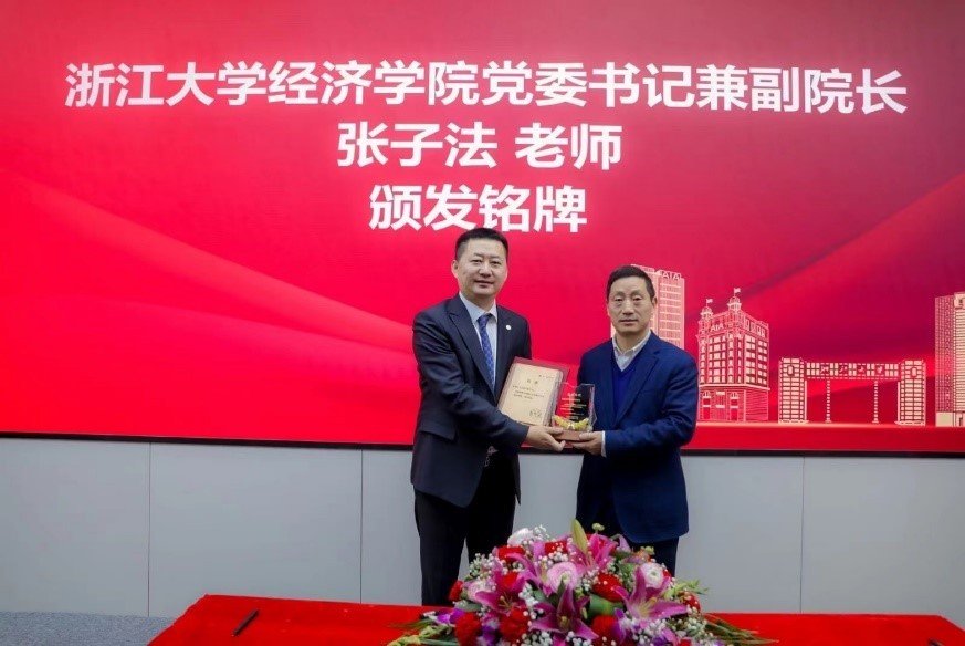 (浙江大学经济学院党委书记兼副院长张子法为友邦人寿首席对外事务官王宏林颁发铭牌。)