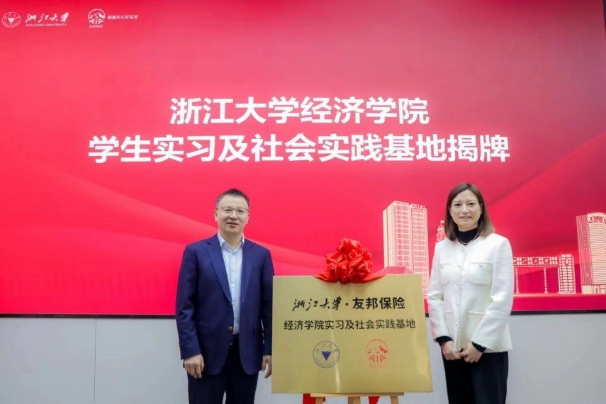 (友邦人寿首席人力资源官张颖与浙江大学经济学院副院长王义中为“浙江大学经济学院学生实习及社会实践基地”揭牌。)