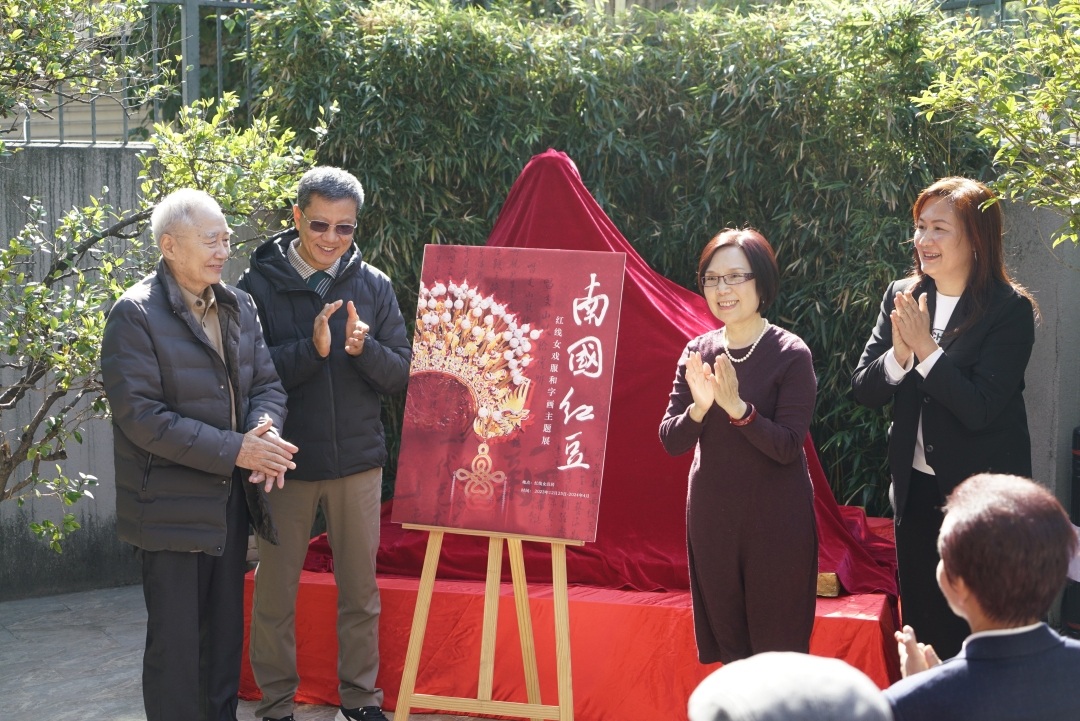 嘉宾为当日开展的“南国红豆——红线女戏服和字画主题展”揭幕