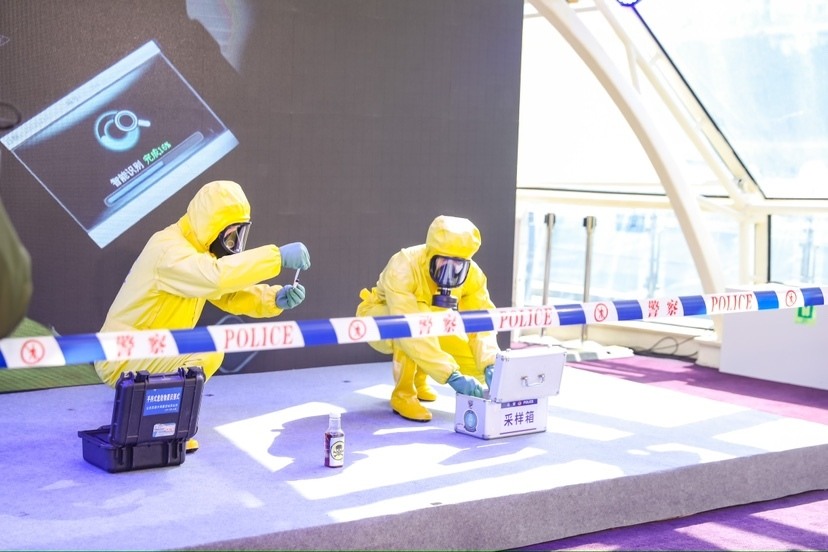 地铁站内,出现不明化学品!穿戴辐射防护服、化学防护服的处置小组民警携带相关装备迅速集结,进入现场展开处置,警戒组穿戴空气呼吸器进行现场警戒,侦查小组手持辐射探测仪、化学气体探测器对现场进行辐射和空气侦检……不要慌!这只是反恐宣传活动中一个处置突发事件的演示场景。