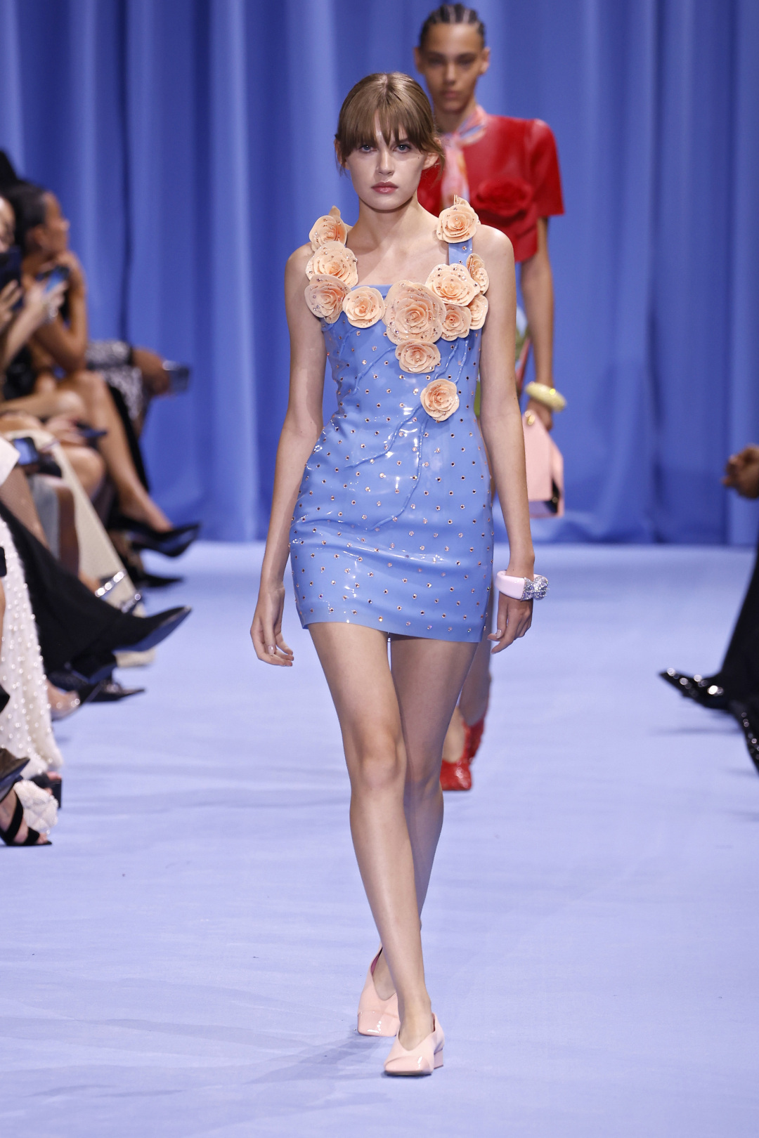 风靡秋冬的“千金玛德琳风”,是2024春夏的“娃娃裙”可爱回潮。以标志性的粗花呢套裙的廓形为底色,设计师们将面料替换成更精致更轻盈的缎感面料,配上马卡龙色系以及亮片与钉珠镶嵌的装饰,甜而不腻,俏丽活泼且能保持优雅知性。其中VERSACE的蓝色娃娃风裙装,更是成为明星名媛们街拍热门单品。