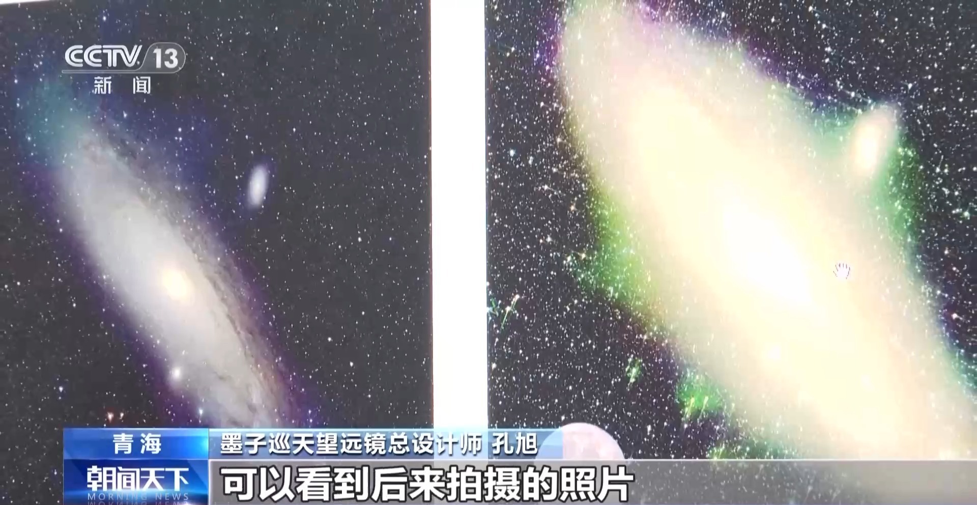 墨子巡天望远镜总设计师孔旭:这张是首光仪式(9月17日)发布的图片,是望远镜早期拍摄的图片。这张是后来,望远镜性能进一步提升以后拍的照片。可以看到后来拍摄的照片把星系外面比较暗的区域都拍摄出来了。说明我们望远镜在经过一段时间的调试后,性能得到进一步提升。