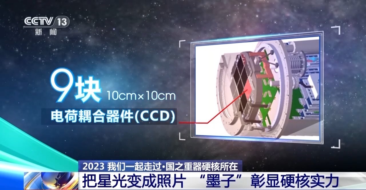 墨子巡天望远镜的探测器由9块10厘米见方的电荷耦合器件CCD拼接而成。每一块CCD上都排布着9000行9000列的像元。它能拍出的照片尺寸惊人,清晰度极高。一张照片,需要90块4k超高清的电视显示屏才能把照片的全尺寸显示出来,10公里外的一个乒乓球都能看清。薄镜面面形主动矫正技术和大靶面CCD拼接相机,由项目团队在国外技术封锁、无从借鉴的情况下努力开发,他们用最短的时间,实现了核心技术的原创突破,大大提高了我国的时域天文观测能力,达到国际先进水平。