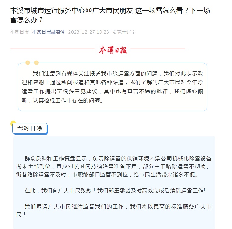 花28亿外包环卫却除不干净雪,辽宁本溪:向广大市民致歉