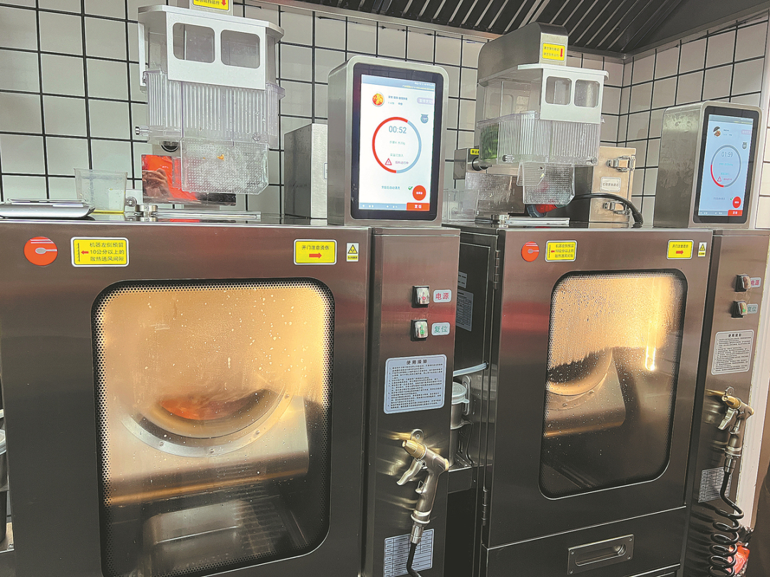 Two robots stir-fry dishes at the canteen. [Photo provided to China Daily]