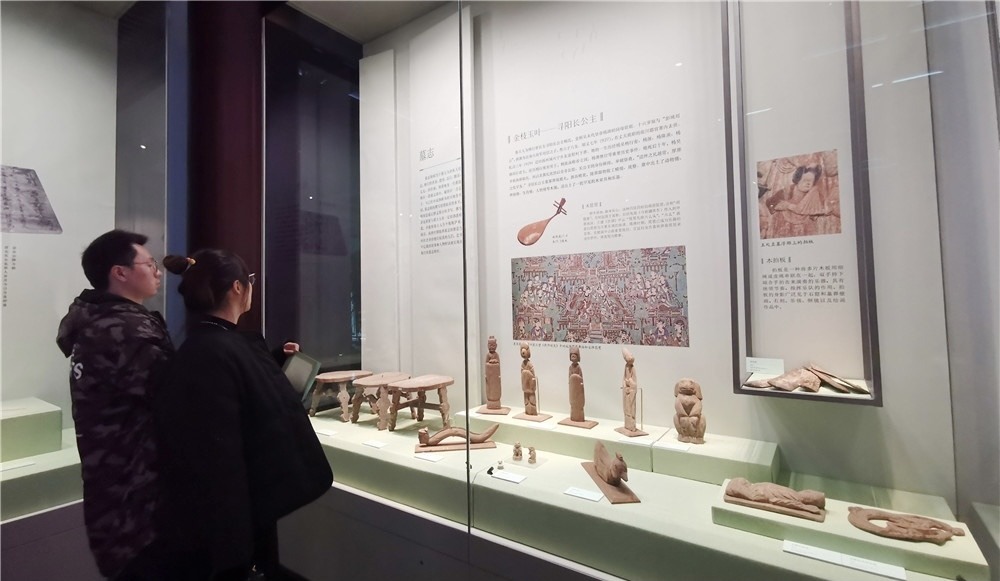 “在这里,有十里长街,有二十四桥,有夜市千灯,有烟花三月,现在让我们跟随一位朝圣之旅上的僧人,一盏随船而下的长沙窑瓷壶,一首‘人生只合扬州死’的诗篇,一起走进杨吴和南唐时期的扬州城……”记者在充满诗情画意的展馆内读到展览前言的描述文字。本次展览以“小切口”呈现“大历史”,通过“扬州城—大运河—扬州人”层层推进的叙事线索,用生动丰富的考古材料展现杨吴、南唐时期的历史文化面貌,以及扬州城市和运河共生共长、相辅相成的历史和城河互动的发展关系。参展的錾刻金佛造像、胡人棺饰、鹤棺饰、产自国内名窑的精美瓷器等精品文物,以及寻阳长公主墓、吕德柔墓出土的一批精美木俑是首次集中面向公众展出。