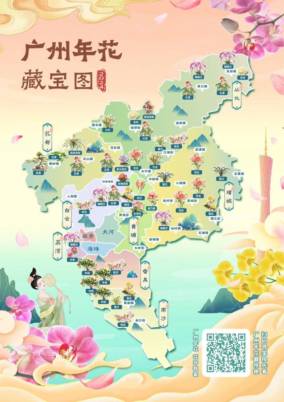 为大力促进今年的年花销售,让全国花卉采购商以及广大市民能更方便买到心仪的年花,广州市农业农村局已提前收集全市主要的花卉种植大户和生产企业年花上市情况,并精心绘制了广州年花藏宝图。