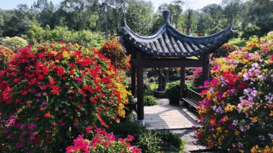 这里的三角梅花海与奇石、别具一格的岭南园林相融合,营造出“园在花中,花在园里”的艺术意境。