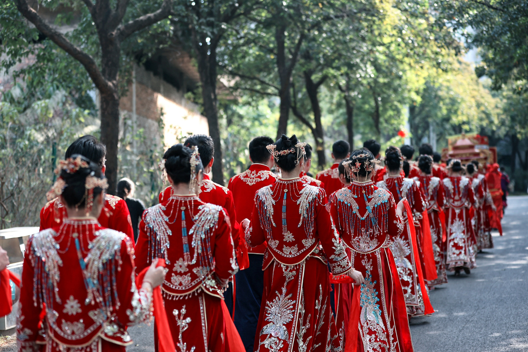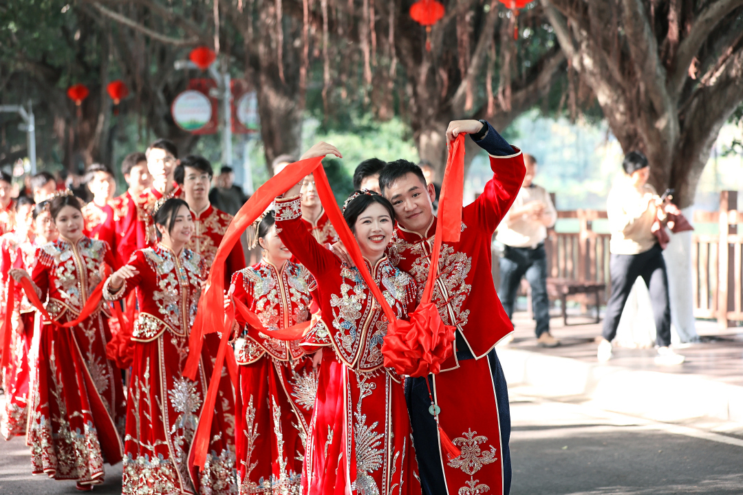 一世良缘天地久,百年好合岁华长。12月28日,广州花都湖国家湿地公园内,随处可见双“囍”拉旗、大红灯笼和红彩带,园林也按岭南传统婚俗披上红妆,30对新人的中式传统迎亲巡游队伍整装待发,活动现场庄重浪漫、仪式感满满。