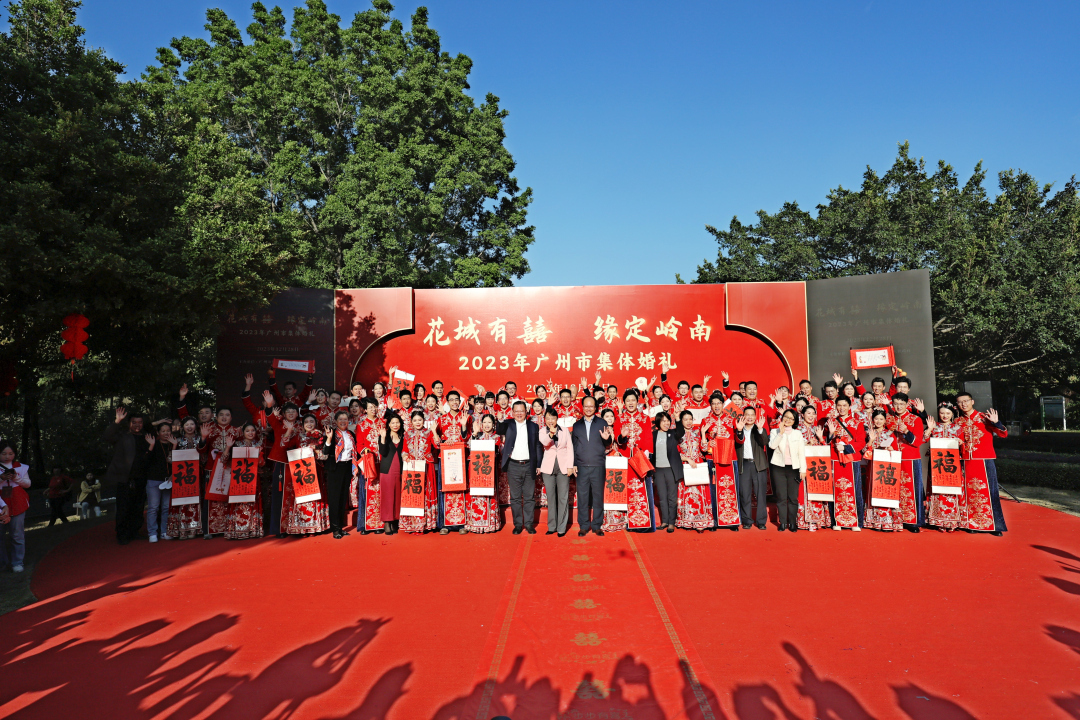 这是广州市民政局、花都区人民政府在花都湖国家湿地公园共同主办的“花城有囍 缘定岭南”2023年广州市集体婚礼。本次活动主要包括婚姻家庭辅导百堂公益课进村居启动仪式、婚俗改革宣传教育千人志愿服务队授旗仪式和“花城有囍 缘定岭南”集体婚礼等内容。