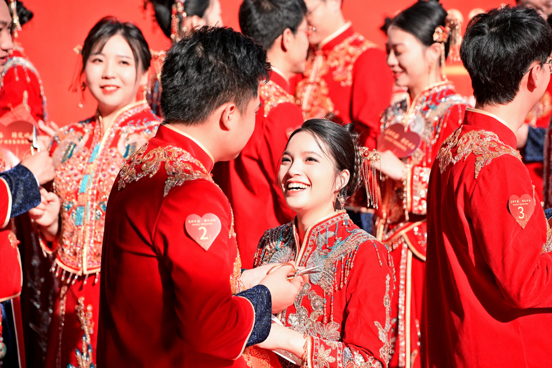 主会场里,30对新人身着传统中式婚服执手走上红毯,行岭南传统婚嫁仪式“三拜礼”“结发礼”和“合卺礼”,在亲朋好友和围观群众的祝福声中,共同迈向幸福人生的新起点。