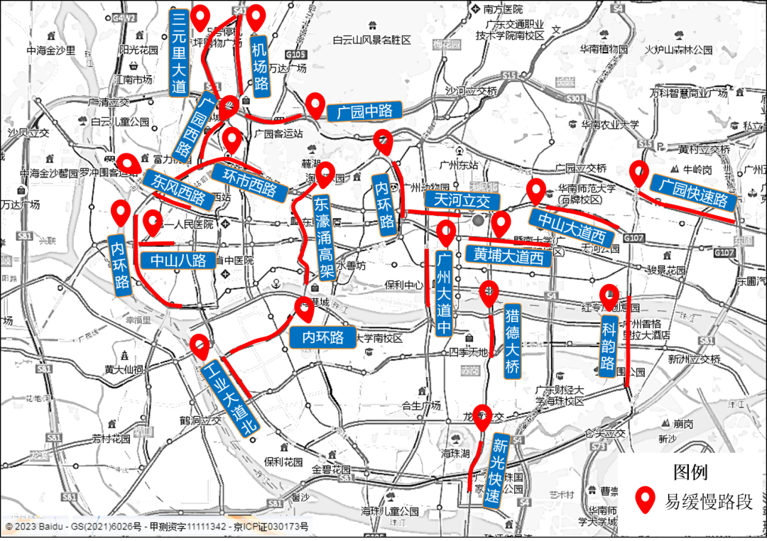 易缓慢路段主要分布在机场高速(三元里—蚌湖立交段)、乐广高速(花山互通立交—花山隧道段)、华南快速路(龙洞收费站—春岗立交段)、华快三期(平沙立交—朝阳立交段)、北二环(蚌湖立交—龙山立交段)、广河高速(春岗立交—八斗立交段)、广清高速(广清立交—朝阳立交段)、沈海高速(蚌湖立交—和顺立交段)、莞佛高速(坦尾立交—虎门大桥段)、南二环(东涌立交—张松立交段)等。
