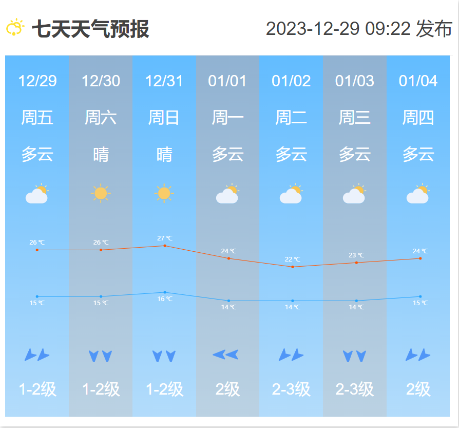 预计未来三天多云到晴为主,天气干燥,街坊们记得多补水啦!假期后期,受到弱冷空气的影响,气温将迎来小幅下降,大家注意做好保暖措施哦!