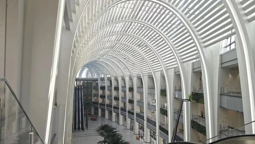 “从高架候车厅落地灯到站台灯带,橙红色线条与柔和光源相互辉映;从站台扶梯到消防栓铝板,木棉花元素绽放在站房各个角落。光谷空间明亮大气,两侧引入生态植被、园林景观,在光影交织中塑造一片绿谷,嵌入月洞门、骑楼街等传统文化符号,透过粤曲雨打芭蕉、彩云追月的意境,传达出广州人开放包容的精神气质。”中铁建工集团广州白云站项目深化设计负责人薛娇介绍。