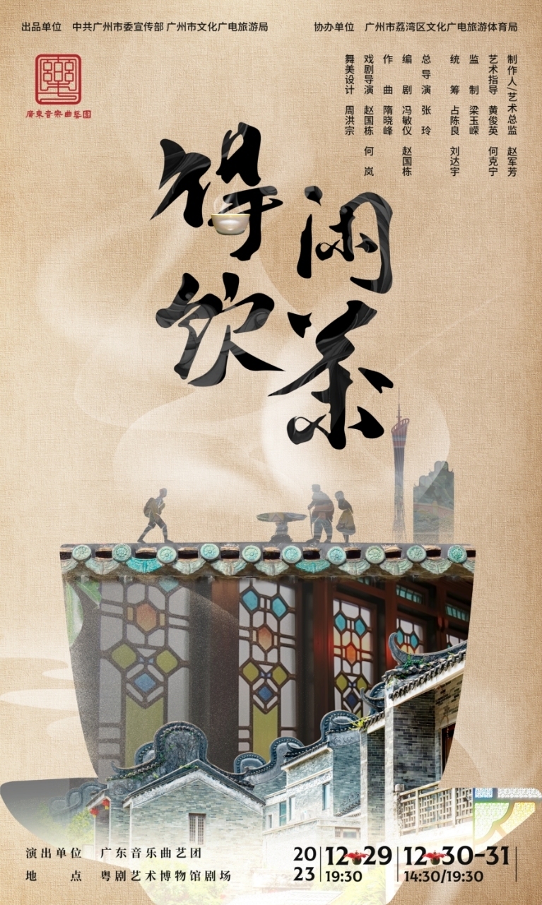食在广州烟火盛,茶和天下湾区情。由中共广州市委宣传部、广州市文化广电旅游局出品,广州市荔湾区文化广电旅游体育局协办,广东音乐曲艺团创演的曲艺新剧场《得闲饮茶》将于2023年12月29日—31日在粤剧艺术博物馆连演5场。