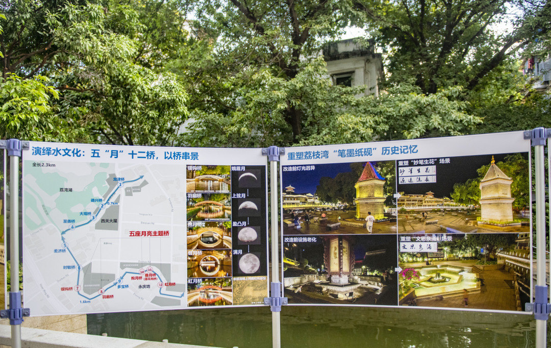 荔枝湾涌从逢源路起,至永庆坊止,水面共有龙津桥、德兴桥、大观桥、至善桥、柔济桥、时敏桥、银钩桥、羽扇桥、多宝桥、抱月桥、叠月桥、虹月桥共十二座不同时期风格各异的桥梁。项目实施“一桥一策”改造,以桥体安全修补为主,运用桥名文化标识,增强在地性和识别感。此外通过以“月相·桥”为主题,优化照明设计,突出桥与水的呼应,其中银钩桥、羽扇桥、抱月桥、叠月桥、虹月桥五座桥,基于原设计的桥拱高度,配合照明倒影效果,演绎出峨眉月、上弦月、凸月、满月的月相变化。
