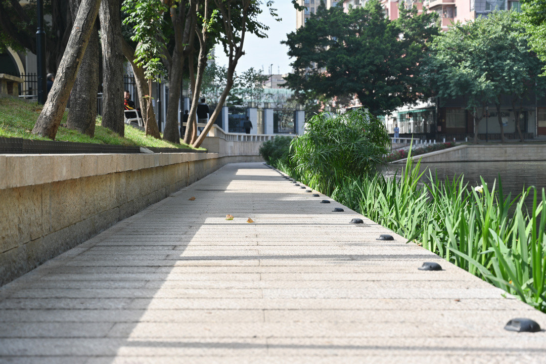亲水驳岸在保留原有栈道的基础上贯通改造,新增安全提示栏杆、提示照明、警示牌等,为市民提供安全舒适的散步路径,拉近市民与荔枝湾涌的距离,把原来长满杂草不足1m的隐蔽临时路变为3m宽的安全步道,打通2个滨水步道断点,形成步道、绿化、驳岸的多层次亲水公共空间。