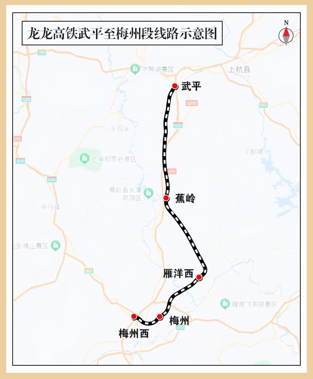 龙龙高铁分为三段建设,龙岩至武平段已经在2023年12月26日开通运营;梅州至龙川段计划2024年下半年建成通车;武平至梅州段将于2024年上半年全面动工建设,全线设蕉岭、雁洋西、梅州、梅州西4座车站。
