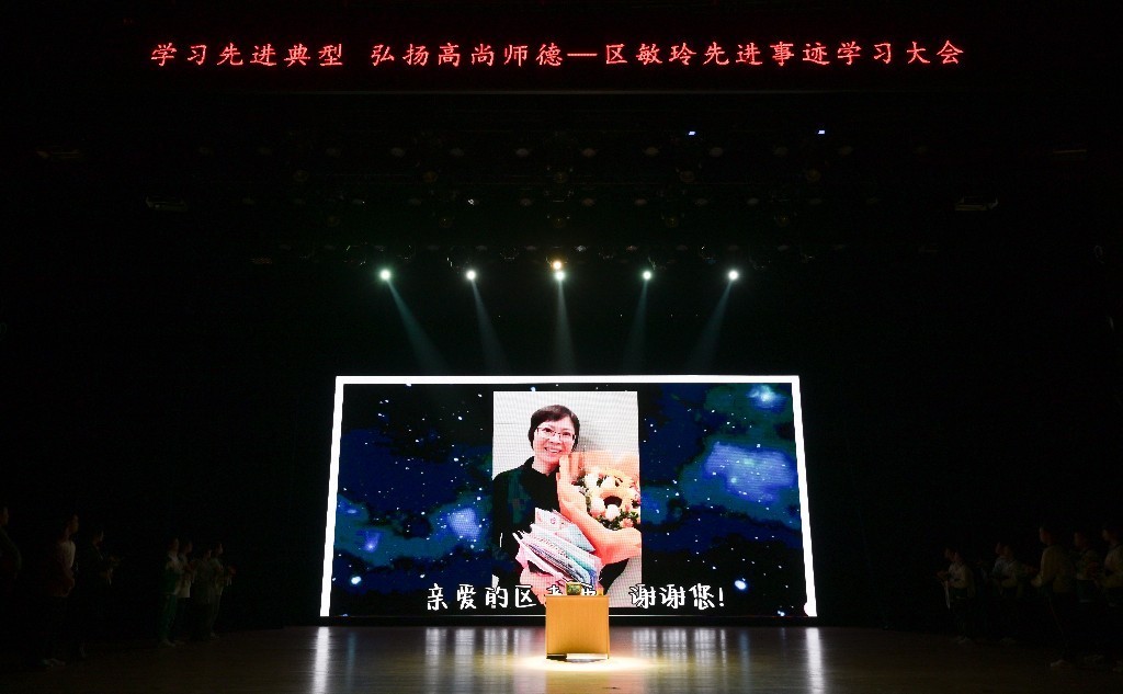 如今,以区敏玲老师为原型的原创话剧《夜空中最亮的星》首演,更是令佛山广大师生深受触动。12月27日,由佛山市教育局主办、顺德区教育局承办的“学习先进典型 弘扬高尚师德”——区敏玲先进事迹宣讲会在容桂大剧院举行,上述话剧进行首演。该剧以电影蒙太奇的表现方式重温了师德标兵区敏玲短暂却精彩、大爱而无私的一生。
