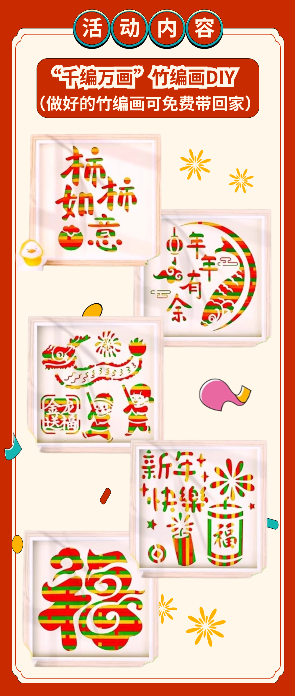 做好的竹编可以带回家,成为今年春节与众不同的挂画,也可以编一个水果竹篮子,快来发挥你的想象力吧!