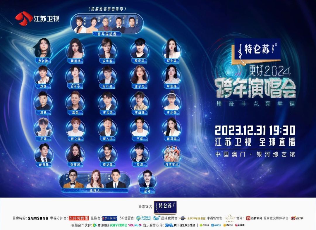 2024年脚步越来越近,《更好2024江苏卫视跨年演唱会》即将于12月31日19:30盛大开唱。近日,晚会全阵容海报出炉:G.E.M.邓紫棋、鞠婧祎、李宇春、林俊杰、刘令姿、刘维、刘宇宁、毛不易、孟子义、单依纯、汤非、陶喆、王俊凯、王啸坤、王心妤、王源、薛之谦、颜人中、于适、曾可妮、曾舜晞、张靓颖、周华健、周深、自得琴社、赵兆实力集结,李好、张纯烨、李响担纲主持人,更有成方圆、屈萌、苏童、王计兵、王昱珩作为奋斗讲述者代表,围绕“幸福是什么”分享奋斗故事,与广大观众共同迈向更好2024。