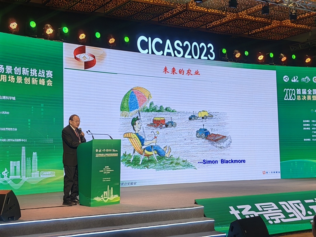在主论坛演讲的最后,他展示了一张来自英国著名农业机器人专家Simon Blackmore的漫画:一个年轻人,在撑着伞的椅子上躺着,手里拿着一杯饮料,脸上笑嘻嘻,远远看着田里的机器干农活。“田间所有机器都有一个特点,全部是无人驾驶的,这就是明天的农业。”