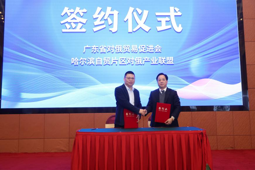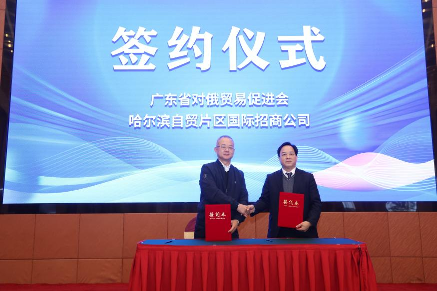 推介会现场,广东省对俄贸易促进会分别和哈尔滨自贸片区对俄产业联盟、哈尔滨自贸片区国际招商公司进行了战略合作签约仪式。广东省对俄贸易促进会将以本次签约为契机,进一步深化与哈尔滨自贸片区的交流合作,通过发挥各自优势、加强友好往来,携手为推动中俄贸易添砖加瓦。