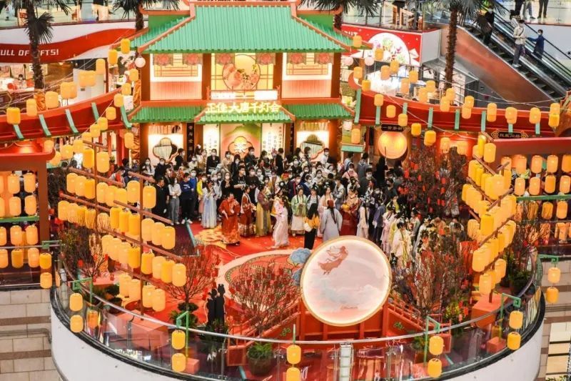 打造年货一条街、非遗市集,汉服和新新人偶公仔现场巡游,推出购物赠礼盲盒大作战。