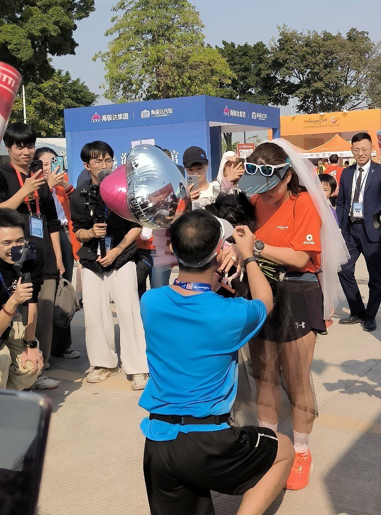 1月1日,佛山顺德容桂环岛马拉松现场。半程马拉松跑友李奕爱向陈家旺求婚,甜蜜爆表!