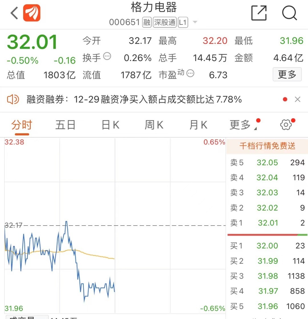 截至2024年1月2日上午收盘,格力电器暂报32.01元/股,下跌0.5%。