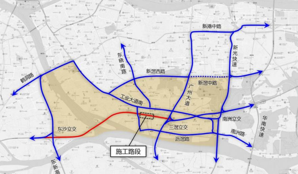 施工核心区域内,可利用鹤洞路、新滘西路、工业大道南、环岛路、东晓南路、东沙立交、南洲立交进行绕行通过施工区域。