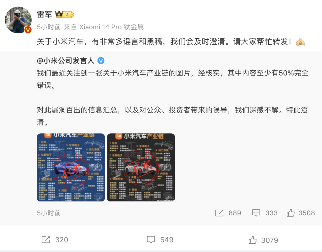 广州日报·新花城全媒体记者留意到,1月2日,小米公司发言人发微博表示:“我们最近关注到一张关于小米汽车产业链的图片,经核实,其中内容至少有50%完全错误。对此漏洞百出的信息汇总,以及对公众、投资者带来的误导,我们深感不解。特此澄清。”