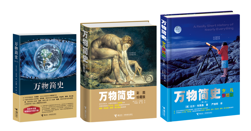《万物简史》是比尔·布莱森轰动全球的扛鼎之作,该书简体中文版由接力出版社于2005年2月推出,之后又先后出版了《万物简史(彩图珍藏版)》和《万物简史(少儿彩绘版)》。截至目前,3个版本的销量已超过180万册,销售码洋近1.3亿元,成为近二十年来国内图书市场表现最出色的科普图书之一。与此同时,该书还荣膺包括中华优秀出版物(图书)奖、国家图书馆文津图书奖、吴大猷科学普及著作奖佳作奖、中国科普作家协会优秀科普作品奖等在内的数十项大奖。
