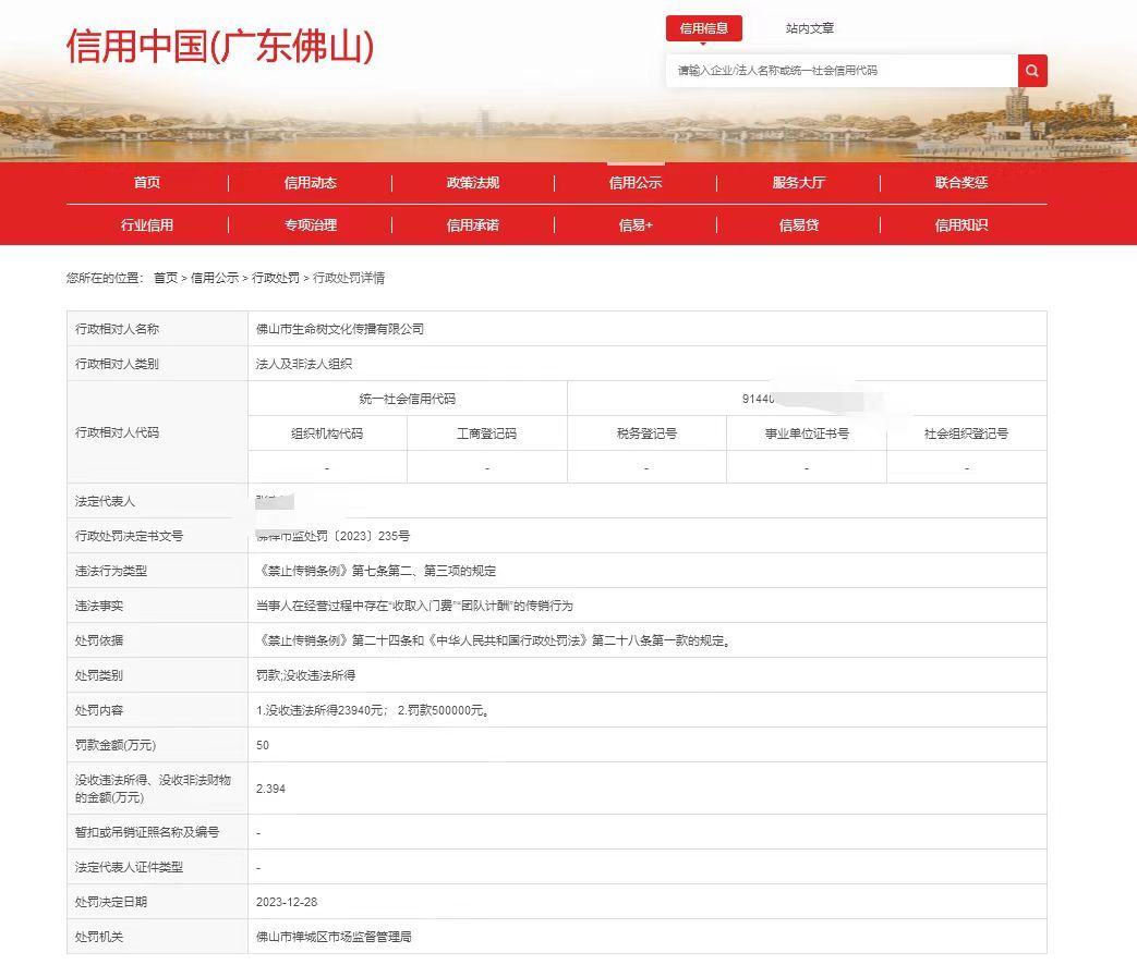 广州日报记者从信用中国(广东佛山)网站获悉,根据《禁止传销条例》第七条第二、第三项的规定,佛山市禅城区市场监督管理局近日对佛山市生命树文化传播有限公司进行违法处罚,处罚内容包括:没收该公司违法所得23940元,并对该公司罚款500000元。