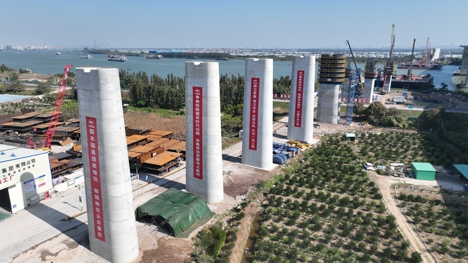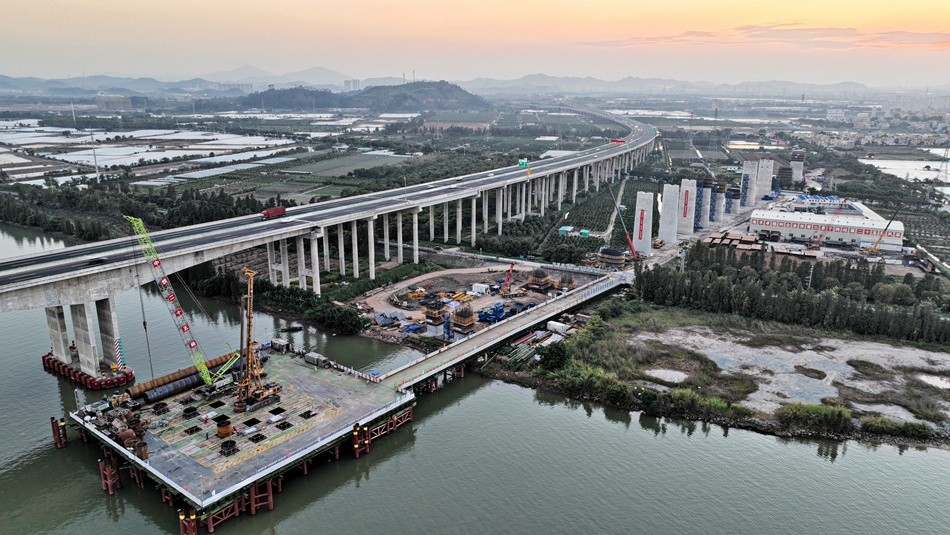 走进位于江门市新会区的跨虎跳门水道斜拉桥施工现场,只见一排高墩矗立在虎跳门水道旁,工程车辆来回穿梭,作业人员分工协作,钢筋绑扎、混凝土浇筑、承台搭建等各项施工有条不紊。
