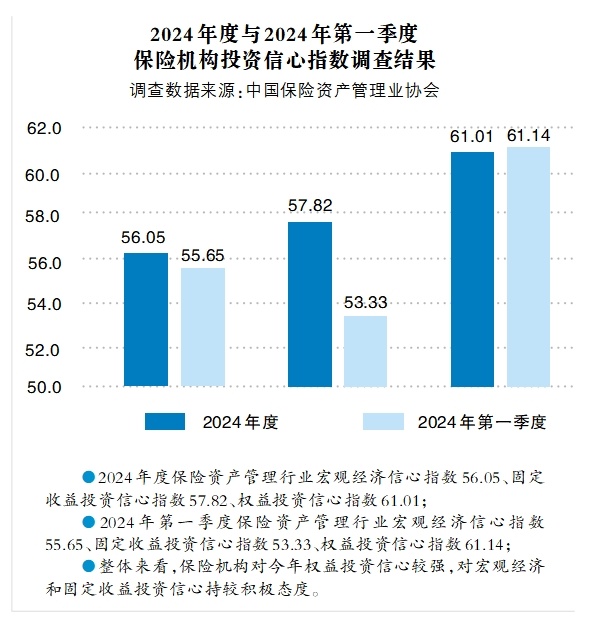 另一方面,保险机构今年在投资端的表现也备受关注。近日,中国保险资产管理业协会发布“保险资产管理行业投资信心指数”显示,保险机构对津南权益投资的信心较强,对宏观经济和固定收益投资信心持积极态度。权益投资信心指数方面,保险机构主要聚焦上证指数、沪深300、中证800、上证50、创业板指和科创50。大多数保险机构预计均将小幅上涨,但全年看涨预期略高于第一季度。